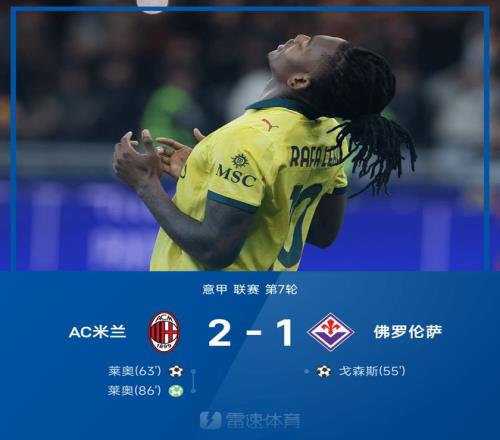 雷速体育10月20日宣 25/26赛季意甲联赛第7轮,AC米兰2-1战胜佛罗伦萨。上半场比赛两队互交白卷,下半场比赛戈森斯混战破门帮助佛罗伦萨首开纪录。随后莱奥远射破门扳平比分,比赛最后时刻莱奥点射破门梅开二度,帮助米兰成功完成逆转。