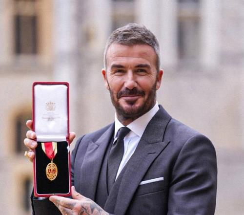 贝克汉姆因其对体育和慈善事业的贡献,在6月份的国王生日授勋名单中获得了表彰,贝克汉姆的妻子维多利亚为他设计了出席此次活动的三件套西装,她与贝克汉姆的父母泰德和桑德拉一起在城堡里参加了授勋仪式。