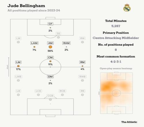 阿隆索在几次新闻发布会上表示,希望他踢中场位置,同时不失去在对方禁区的影响力。贝林厄姆则更倾向于踢更靠前的位置,就像他前任教练卡洛·安切洛蒂使用他的方式一样。下图显示了贝林厄姆自2023年加盟皇马以来主要踢攻击型中场,同时在上赛季也出现在左路。