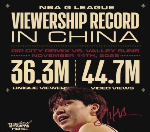 波特兰开拓者队携手自己在NBA发展联盟的下属球队撕裂之城混音队进行了官宣,表示杨瀚森在11月15日参加的混音队跟山谷太阳队的比赛,创下了该联赛在中国大陆地区的收视纪录。