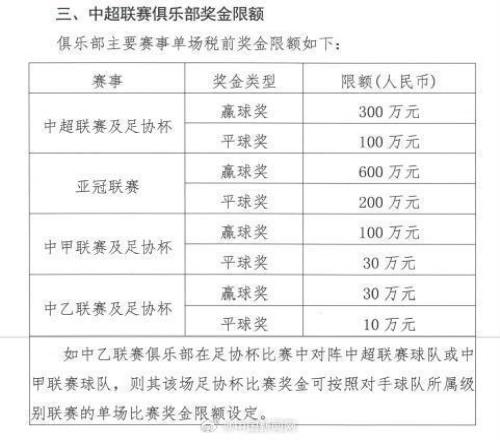 此外,中足联印发三级联赛财务指标,其中包含俱乐部奖金限额。中超球队联赛单场赢球奖金不得超过300万元。